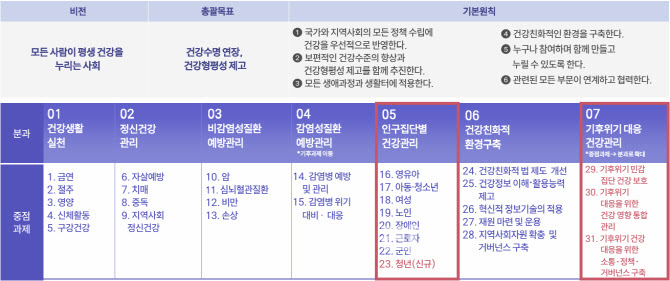 'Á¦6Â÷ ±¹¹Î°Ç°ÁõÁøÁ¾ÇÕ°èȹ(2026~2030)' Àǰá û³â °Ç° ÁßÁ¡°úÁ¦ ¼³Á¤¡¦Ãë¾àû³â º°µµ °ü¸® ±âÈÄ À§±â µ¹º½Ã¼°è ¸¶·Ã¡¦±âÈÄÀç³ ÇÇÇØ ½É¸®Áö¿øÁ¤ºÎ°¡ û³â °Ç° ÁõÁøÀ» ±¹°¡ ÇÙ½É °úÁ¦·Î »ï°í, ±âÈĺ¯È¿¡ µû¸¥ °Ç° À§Çù±îÁö Æ÷°ýÀûÀ¸·Î ´ëÀÀÇÏ´Â ÁßÀå±â °Ç°Á¤Ã¥À» ³»³ù´Ù. | | Á¦6Â÷ ±¹¹Î°Ç°ÁõÁøÁ¾ÇÕ°èȹ ü°èµµ. »¡°£»öÀÌ ½Å¼³µÈ ºÎºÐ(ÀÚ·á=º¸°Çº¹ÁöºÎ) |