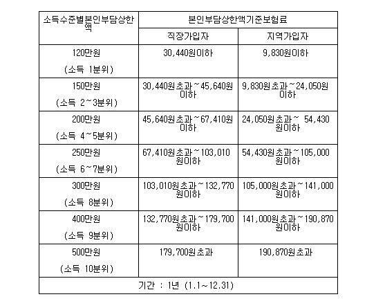 2014³â 1¿ùºÎÅÍ °¡ÀÔÀÚ ¼Òµæ¼öÁØ¿¡ µû¶ó ¿¬°£ º»Àκδã»óÇѾ×À» ±âÁ¸ 3´Ü°è¿¡¼ 7´Ü°è·Î ¼¼ºÐÈÇØ Àû¿ëÇϰí ÀÖ´Ù. Áï, Àú¼ÒµæÃþÀÎ ¼Òµæ 1ºÐÀ§(1µî±Þ) 120¸¸¿ø, ¼Òµæ 2~3ºÐÀ§(2µî±Þ) 150¸¸¿ø, ¼Òµæ 4~5ºÐÀ§(3µî±Þ) 200¸¸¿ø, ¼Òµæ 6~7ºÐÀ§(4µî±Þ) 250¸¸¿ø, ¼Òµæ 8ºÐÀ§(5µî±Þ) 300¸¸¿ø, ¼Òµæ 9ºÐÀ§(6µî±Þ) 400¸¸¿ø, °í¼ÒµæÃþÀÎ ¼Òµæ 10ºÐÀ§(7µî±Þ) 500¸¸¿ø µîÀÌ´Ù.