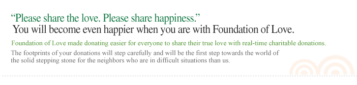 People often say this: ¡°I want to help the poor if I¡¯m financially well, but I can¡¯t afford it now.¡± But it¡¯s not only for the riches or famous corporations. ¡°Helping others doesn¡¯t require a big thing. All you need is a heart sharing what you have.¡± Easy-sharing donation culture has been forming through our ¡°Foundation of Love¡± website for allowing anyone to participate without limitation on the amount of donation.